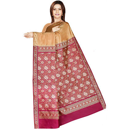 A beautiful art silk saree in combination of mustard and maroon , lined with Banarsi border , a contrast heavy woven design Pallu in multishades of gold ,maroon and brown with a matching mustard blouse. Length:6.30 mts (inclusive of blouse)..
