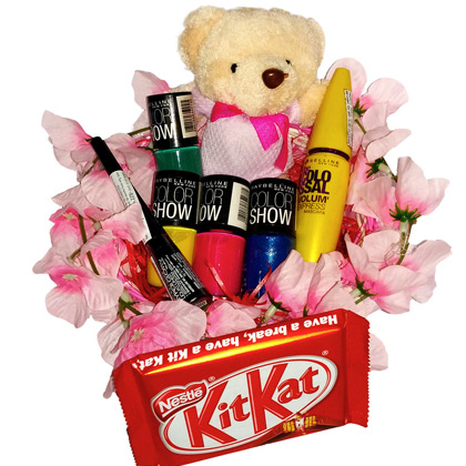 A 10cms wide beautifully decorated basket with a 5" long soft bodied teddy along with a Volume express.Colossal Black Mascara Washable from Maybelline, Maybelline Hyper Glossy Liquid Liner and Four Color Show nail polishes from Maybelline along with a small Kitkat chocolate.