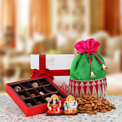 SKU: DWUAEFNP678GALD15Laxmi Murti height 2.5 inches, Ganesh Murti height 2.5 inches, De Miami Assorted Premium Chocolates 12 pcs. Red ribbon, Green & Pink Potley, Almonds 100gms