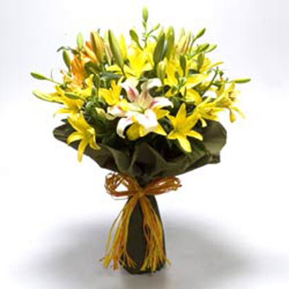 SKU: EX001GAL45A outstanding bunch of 12 yellow & orange and pink asiatic lilies wrapped in a frill paper wrapping and raffia ribbon.