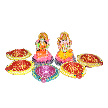 SKU: GALDIWALI68GAL15This beautiful hamper comes with 5 colourful Diyas and divine idols of Laxmi and Ganesha.