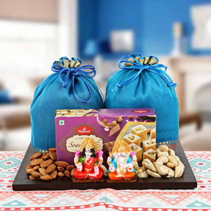 SKU: DWUAEFNP676GALD15Brown Flat Tray 9x11, Haldiram Soan Papdi 250gms, Almonds 100gms, Cashew nuts 100gms, 2 Blue Potley, Laxmi Murti height 2 inches, Ganesh Murti height 2 inches