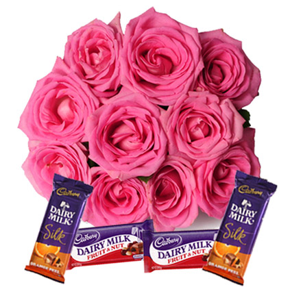 SKU: EXDGAL93Bunch of 10 Pink Roses in cellophane packing with pink ribbon bow and 4 cadbury chocolates ( 2 42gms Cadbury Fruit & Nut and 2 65gms Cadbury Silk chocolate)