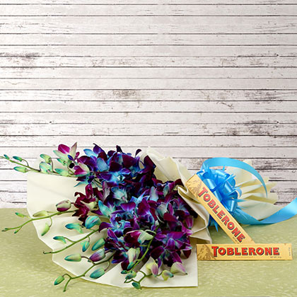SKU: AFF-EXFNP181GAL1610 Blue Orchids, 2 Toblerone Chocolate 50gm, Cream Paper Packing, Blue Ribbon