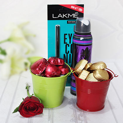 Nothing can delight your beloved then gifting her perfect gift set that have a She Deo 150 ml, one artificial Rose, 2 beautiful bucket, 1 Lakme Eye conic Kajal and 100 gm Assorted Chocolate on Valentine’s Day.