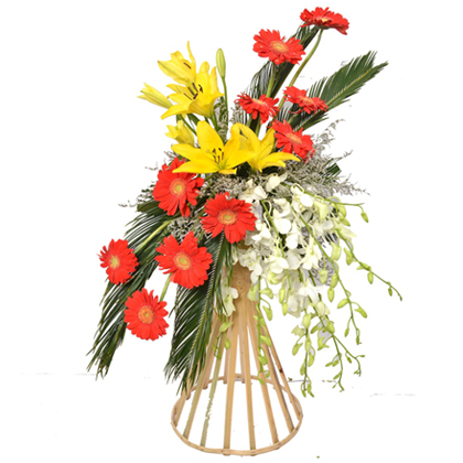 SKU: ADBA042 Lilies,10 Gerbaras and 8 Orchids with a lot of Green Fillers in cane Basket arrangement.