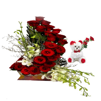 SKU: KEXADCOM 34GALMake Someone Feel Happy With This Lovely Gift Hamper Which Includes 24 Red Roses with 8 Orchids in Basket arrangement and 6" sweet Teddy.