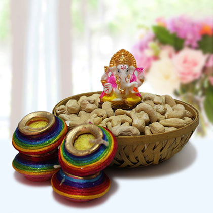 Here is a Diwali gift combo that is inclusive of every element of Diwali celebration to gift someone dear and wish ‘Happy Diwali’. It’s a combo of a Ganesha Idol with a small basket of Cashews and set of colorful Matka Shape Diyas to light home.