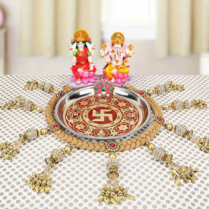 SKU: INTDWFNP684_ROWGALD15Laxmi Murti height 7.5 inches, Ganesh Murti height 7.5 inches, Steel Swastik Thali 11 inches, Shivam Charan Set P101, SHIVAM D. No.324000 Length 36 inches
