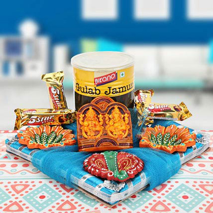 Blue Ribbon Square Tray 9X9 inches, Laxmi Ganesha Brown 3x3 inches, Bikano Gulab Jamun 1000gms, 5 Cadbury Five Star 21.5g, 2 Yellow & Green Diya with stone diameter 3 inches, Red & Green Diya diameter 3 inches, Blue net