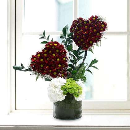 SKU: EXDLUX74GAL1625 Red Daisies 6 Green Daisies 2 White Hydrangea seasonal leaves Glass Vase