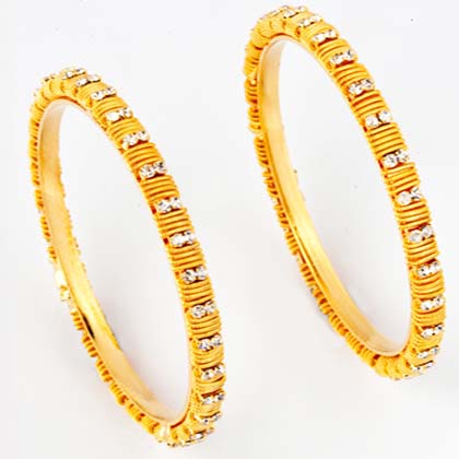 SKU: m14bngl92259GSRGALA set of two beautiful gold polished bangles studded american diamonds .Size: satndard size: 2*6. Metal : Copper, Polish: Gold Plated.