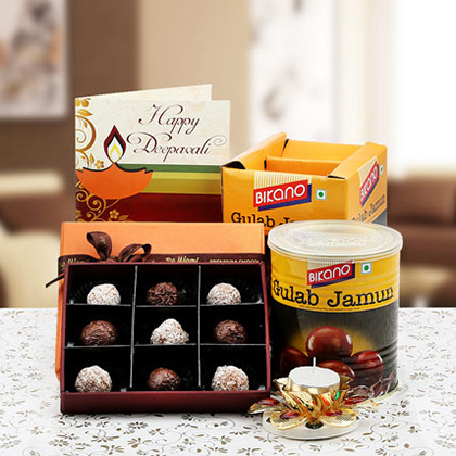 SKU: DWUAEFNP574GALD15Greeting Card, De Miami Truffles set of Nine, Bikano Gulab Jamun 1000gms, golden ,red & green T-light Diya