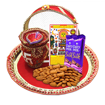 This attractive hamper comes with a decorative piece of Thali, Diya, Kalash, Chhani, Karwa Chauth calendar, two Cadbury diary milk silk and 100 grams of crunchy almonds.