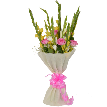 SKU: ADB4115 Yellow and White Glads with 6 Pink Roses in White Paper packing.