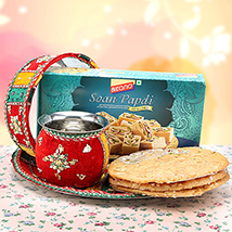 Pink Thali Set (Thali Diameter 12 inches,channi Diameter 7 inches, Vessel Diameter 4 inches), Brown & Haley Cashew Roca Butter crunch Toffee with Cashews 140gms and 2 Lindt Swiss Classic Swiss Milk Chocolate with gently roasted almonds 100gms.