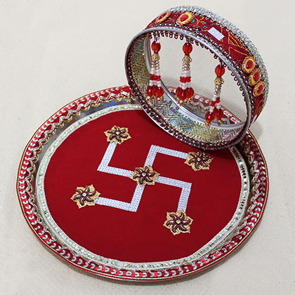 Here is a red decorative Swastika Karwa Chauth Puja Thali which you can gift your beloved wife on this Karwa Chauth to help perform all auspicious rituals of Karwa Chauth festival. She will definitely love such an attractive Puja Thali.