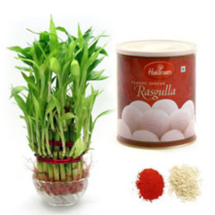 SKU: BDUAE03BD16Send Your Brother This Bhaidooj Lots Of Luck By Gifting Him A 2 Layer Lucky Bamboo, 1kg Rasgullas And Tikka Chawal.