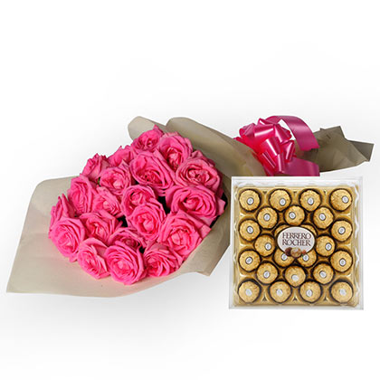 SKU: MN-EXDFNP82DW16Bunch of 25 Pink Roses in cream color paper packing with pink ribbon & box of 300gm Ferrero Rocher chocolate.