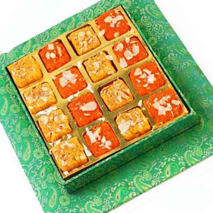 SKU: r13northindianbarfitrayr5GAL-14A Beautiful reusable Green Wooden Satin Tray containing Favourite Moti Pak or Motichoor laddoo Barfi and Moon Dal Barfi. Net Weight: 550 gms.