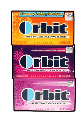 A Pack of 12 Orbit Sugarfree gums in flavours of citrusmint, sweetmint,rasberry mint,spearmint,bubblemint, and peppermint. Each Pack contains 14 chewing gums. It has 40% less fewer calories than sugared gum.These chewing gums helps fight cavities by strengthening teeth. Approved by American Dental Association.Sugarfree Gums are not recommended for children. Ntet Weiight: 410 gms