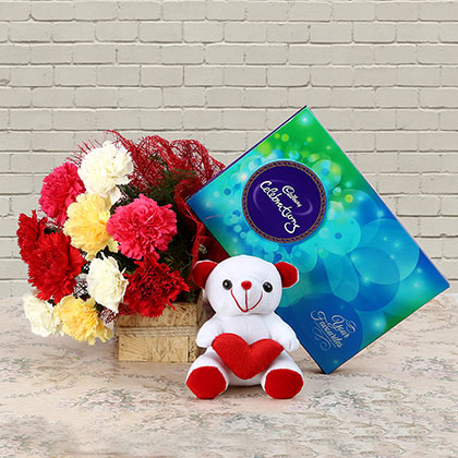 SKU: AFF-EXFNP225GAL163 Red Carnation, 2 Pink Carnation, 2 Yellow Carnation, 3 White Carnation, Cadbury Celebrations 141.5 gm, Teddy Bear 6 inches, Red Jute Wrapping, Yellow Raffia