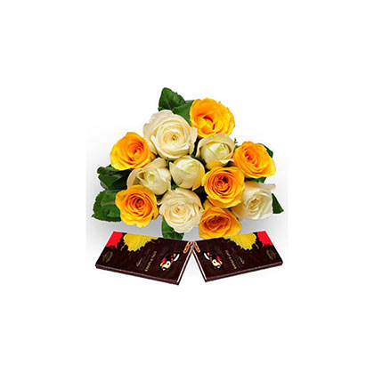 SKU: EXDFNP89GALA tender bunch of 6 white and 6 yellow roses specially for the person you care for the most. These sweet roses are efficiently bunched in a brusque cellophane paper with a yellow ribbon. What`s more? Two 80 gms Cadbury Bournville, a perfect gift for any occasion. Gift this wonderful product from Ferns N Petals to your near and dear ones...