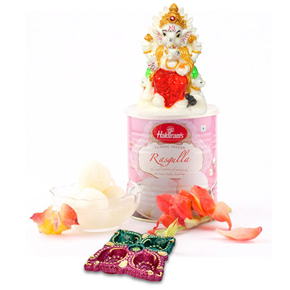 SKU: GALDIWALI97GAL15Celebrate the auspicious festival of Diwali with blessings of Shree Ganesha statue, traditional diya and 1 kg Haldiram’s Rasgulla hamper.