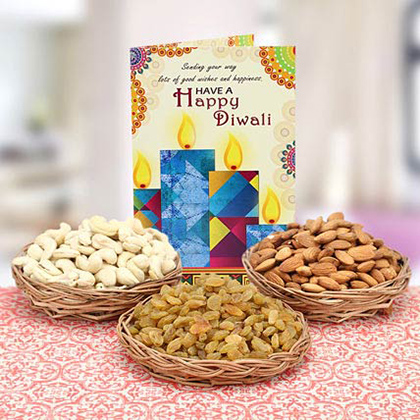 SKU: DWUAEFNP630GALD153 Small Wooden Basket Diameter 5 inches, Almonds 250gms, Cashew nuts 250gms, Raisin 250gms, Greeting Card