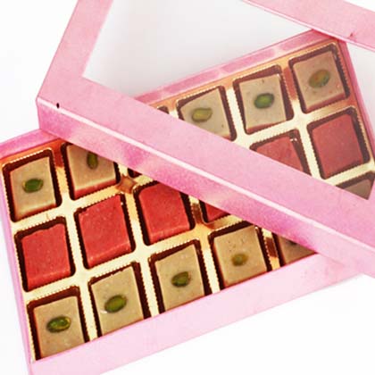 A beauitful gift box containing an Pure kaju Strawberry Squares. These sweets are made from sugar subsitute which is ideal for diabatic and health cautious people.Net Weight: 500 gms.