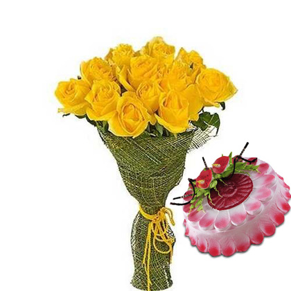 SKU: ADCOM 11GALYellow roses are the perfect way to toast friends, lift spirits and send a general wish for well-being. Send a well designed bouquet of 12 yellow roses in Jute packing with half kg strawberry cake to steal the heart of receiver.