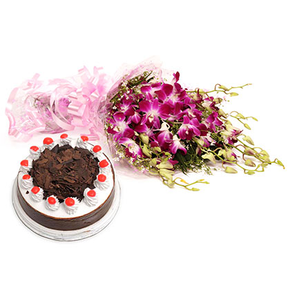 SKU: MN-EXDFNP2024DW16Bunch of 6 purple orchids in a cellophane packing with pink ribbon bow and 1 kg Blackforest Cake. (Please add packet of Candles & Knife along with cake)