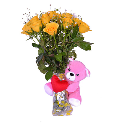 SKU: PRE01GAL16Give a pleasant surprise to your loved one by sending this radiant flower bunch. It consists of 12 Yellow Roses and 6 inches Teddy Bear. Your dear one would be too impressed receiving it.